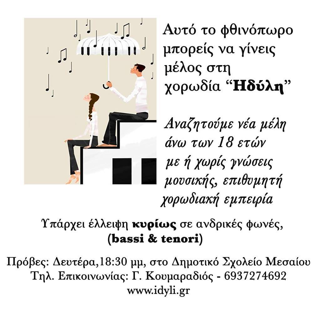 Ανακοινώσεις 02 Σεπτεμβρίου 2017 Πρόσκληση για νέα μέλη της χορωδίας Αυτό το φθινόπωρο μπορείς να γίνεις μέλος στη χορωδία "Ηδύλη"! Προηγούμενο Επόμενο